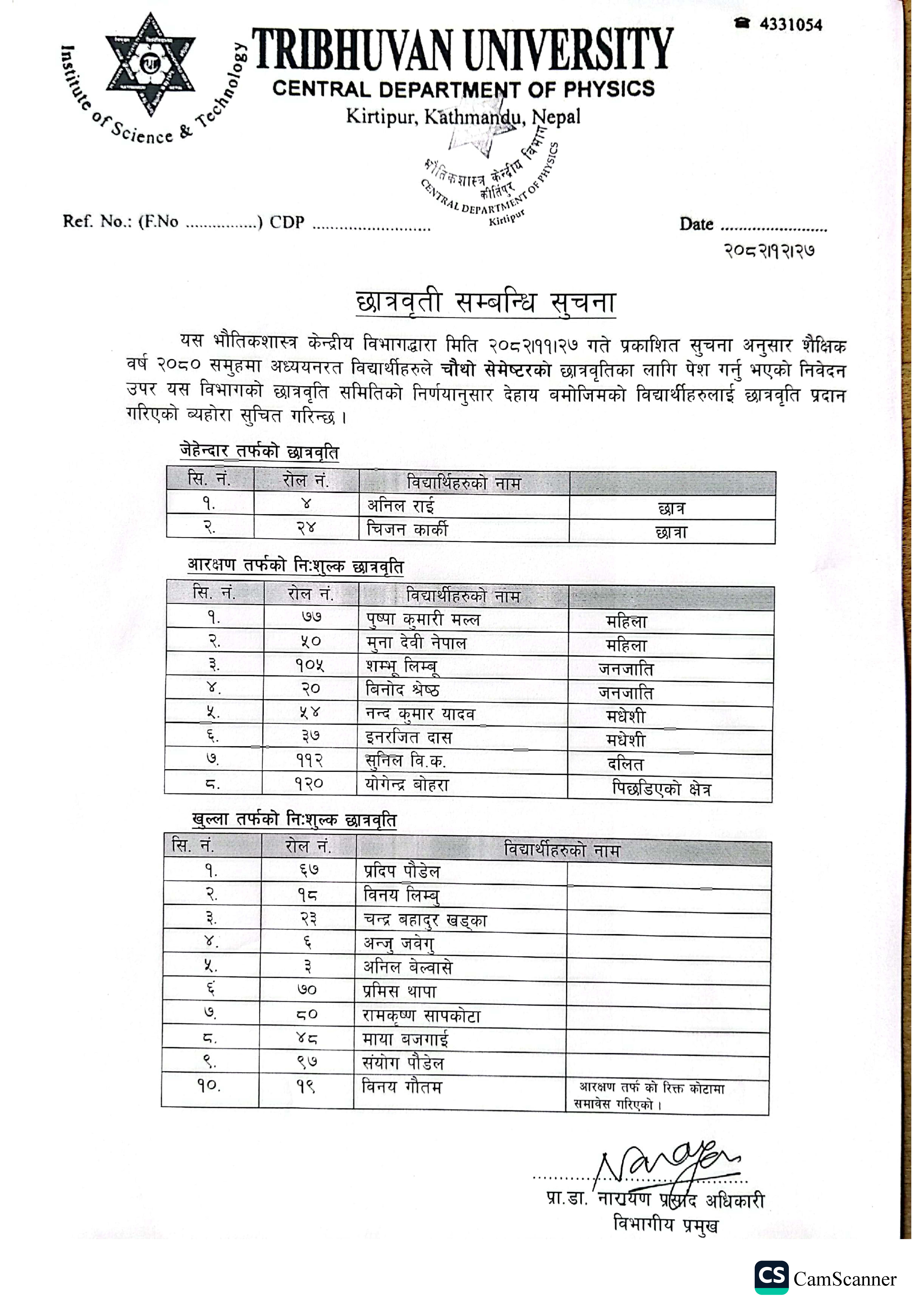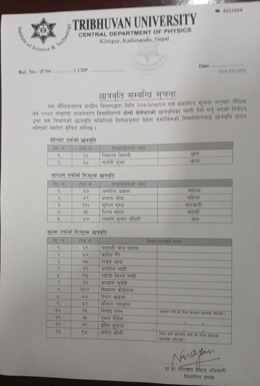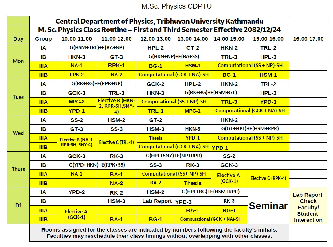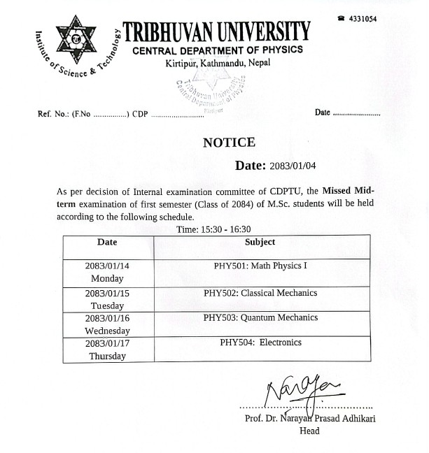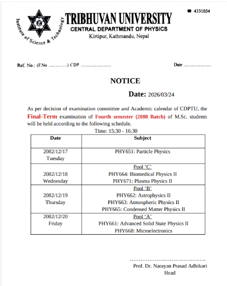 It is my great pleasure to welcome you to the Central Department of Physics (CDP), Tribhuvan University. The Department was founded in 1965. Over the years, around 3,500 students have earned their M.Sc. degrees from CDP, with the current annual enrollment standing at 120 students. As of the end of 2024, 54 PhD students have successfully graduated from CDP, and there are currently 72 PhD candidates pursuing their studies. As the Head of the Department, I am honored to lead a team of dedicated faculty, enthusiastic students, and supportive staff who together have a strong commitment for advancing knowledge in the field of physi... ... ...